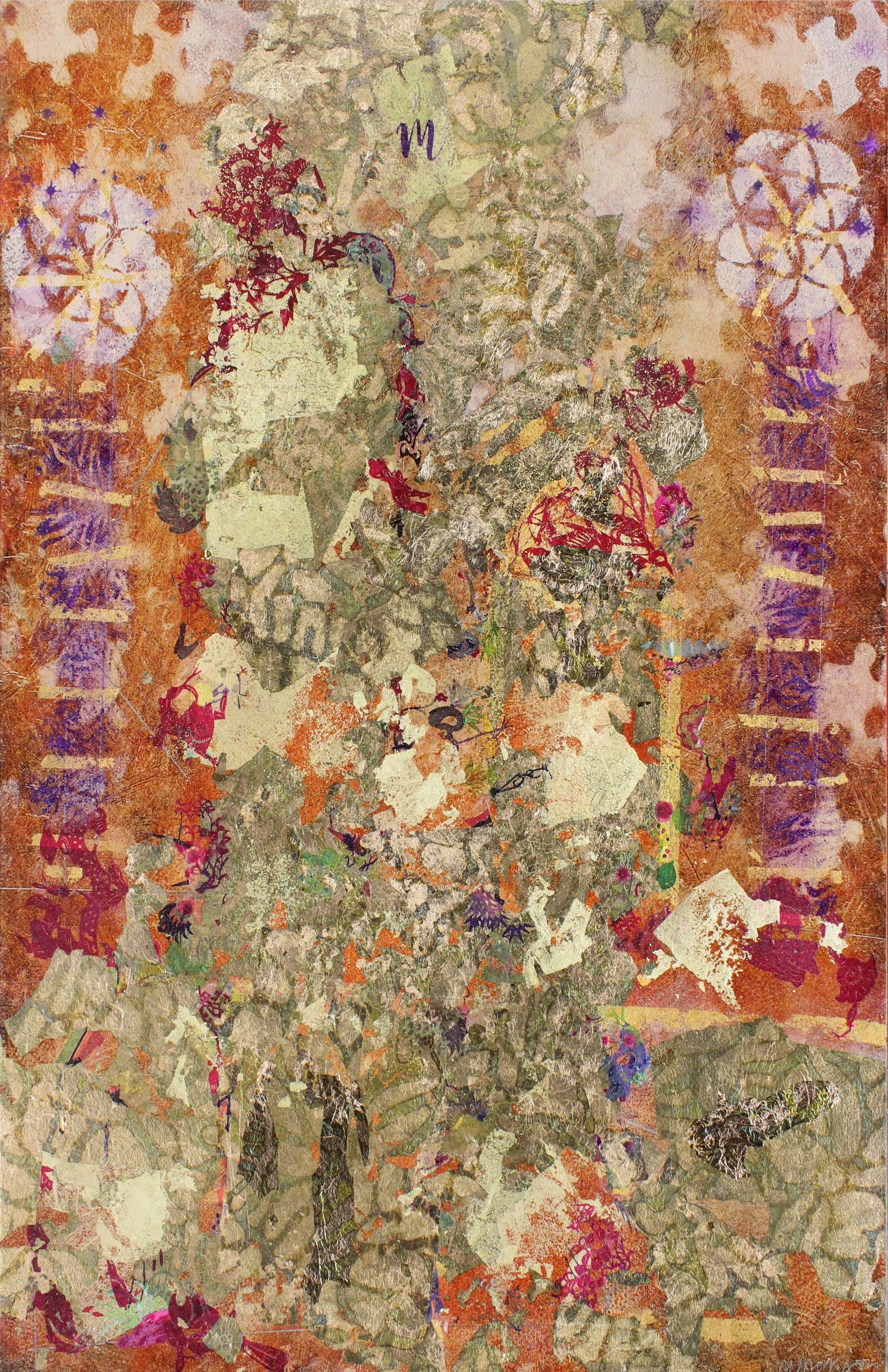 Mixed media, variegated metal leaf on paper